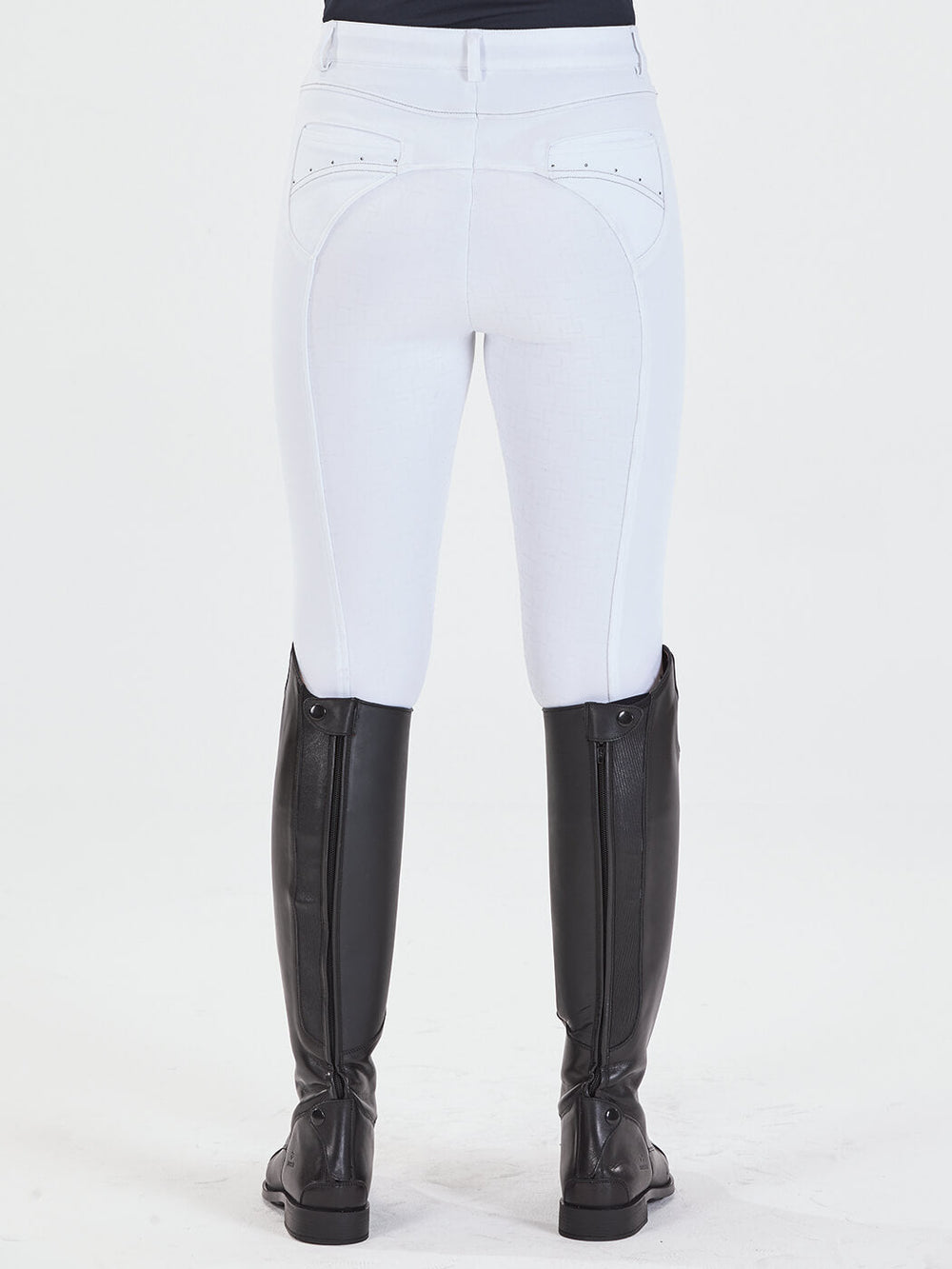 Tailored for Your Comfort The classic cut with a medium waist height offers a timeless silhouette that complements various body types. The elastic waistband ensures a snug yet flexible fit, allowing you to ride with utmost confidence. The comfortable leg ends, complete with elastic inserts, provide the perfect finish to your equestrian ensemble.
