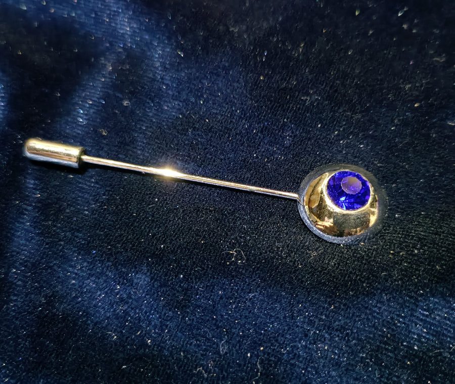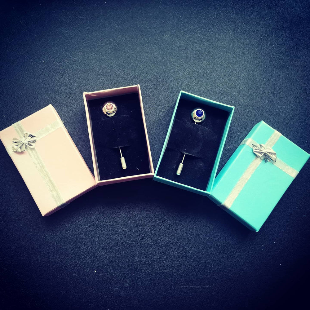 A silver-colored pin with a framed crystal. A plastron pin for universal use, e.g. as a decoration for attaching to a lapel. Sold in a small gift box.