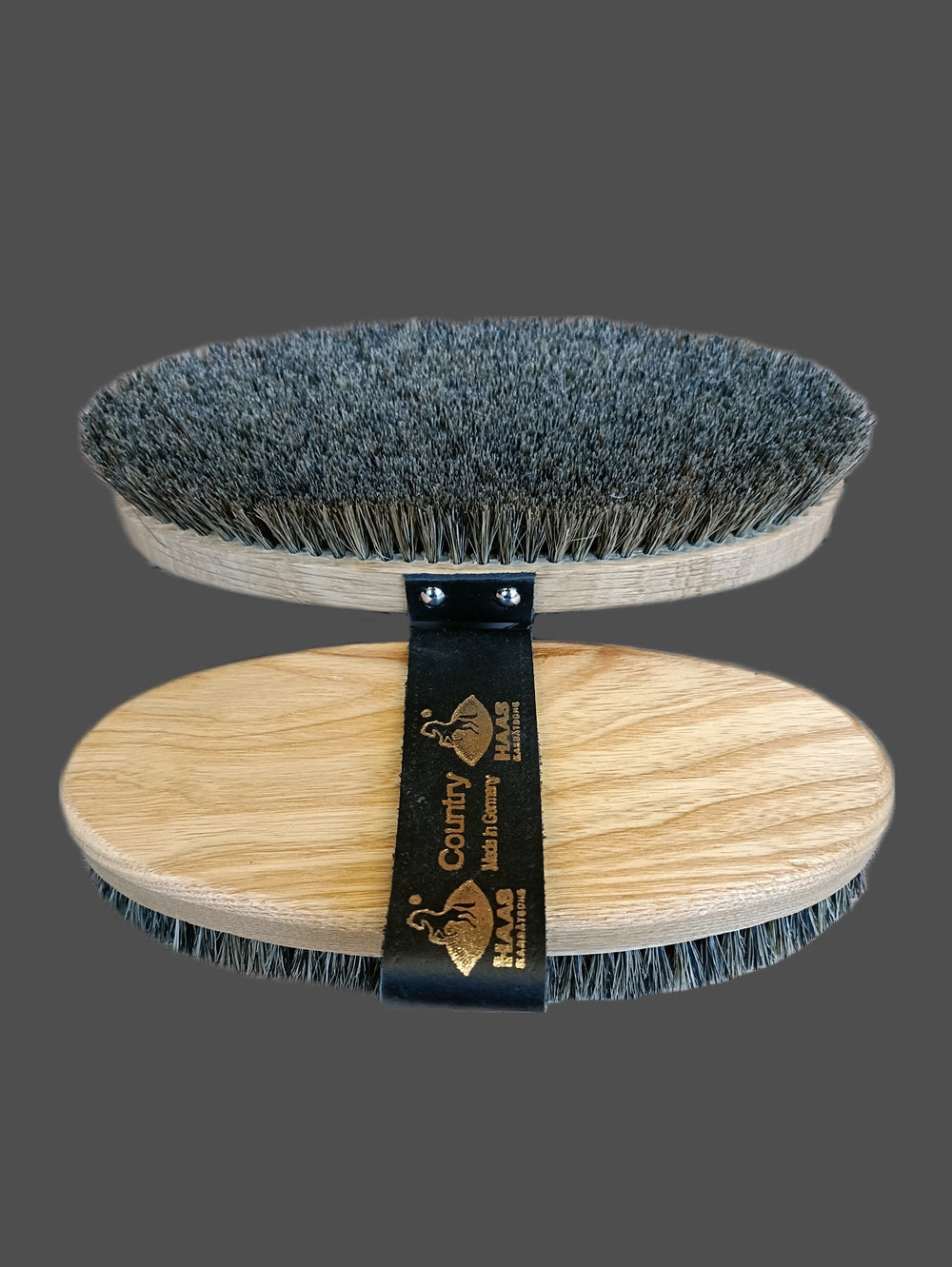 The oiled wooden back and the strong natural bristles give this grooming brush a particular flair.