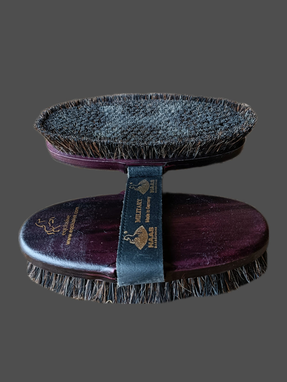 For a thorough cleaning effect, whilst the shorter bristles remove dust and enhance the shine for a sleek, glossy result. The shorter and stronger bristles are for a thorough cleaning effect, whilst the longer bristles remove dust and enhance the shine.Amazing at removing dust from chestnut horses!Soft but well-combined hair ensures that even the most sensitive horses love this brush!This brush locks into a soft coat and ensures that every dirt, sweat and dust is taken to the coat's surface. A fair amount and density of horse hair mixture have been used for this brush. The border is edged with longer bristles. Clean your horse's coat to perfection with HAAS Military Ladies! Our brush is designed with shorter and stronger bristles to provide a thorough cleaning effect, while the longer bristles remove dust and enhance the shine. The soft but well-combined hair is gentle on the most sensitive horses, ensuring they will love being groomed. With a fair amount and density of horse hair mixture, this brush effectively removes dirt, sweat, and dust from your horse's coat. The brush's border is lined with longer bristles for an added touch of quality. Trust HAAS Military Ladies for a sleek, glossy shine every time.