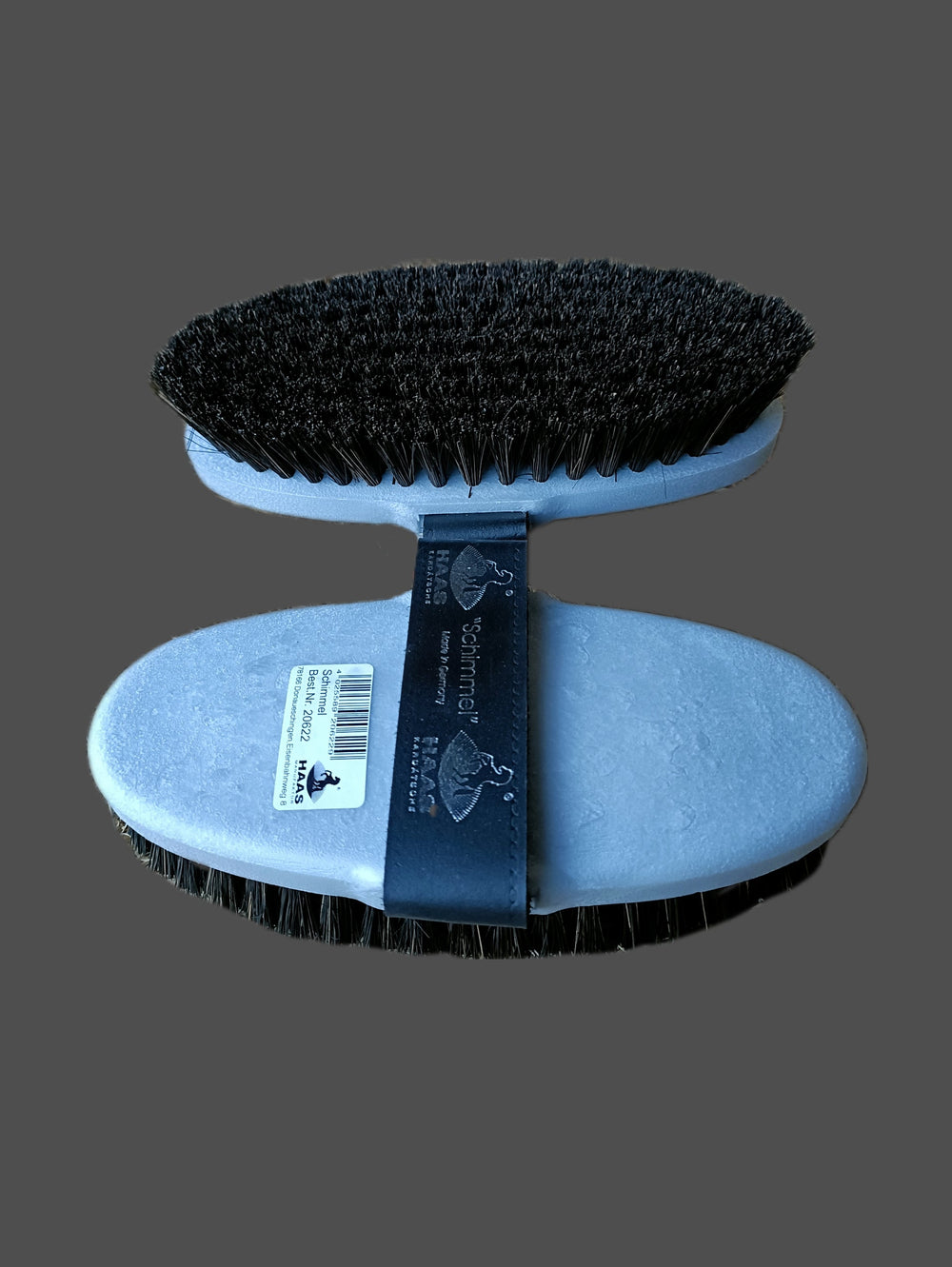 Got a stain monster of a horse? Then you definitely need to add the HAAS Schimmel brush to your grooming kit! This world-famous Haas brush is made from a mixture of tight, firm coconut fibre bristles and is excellent for quickly and easily removing dried-on mud and stains from your horse's coat with spectacular results. It is beneficial for removing stable stains from grey or white horses and markings - it's a true saviour for cleaning white socks! It is very comfortable to hold with a genuine leather handle. The Haas Schimmel Brush is available in Silver, Ladies' size.
