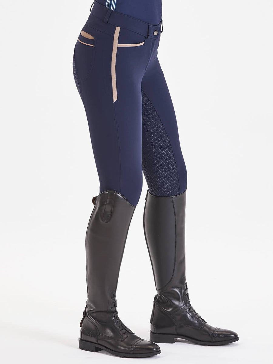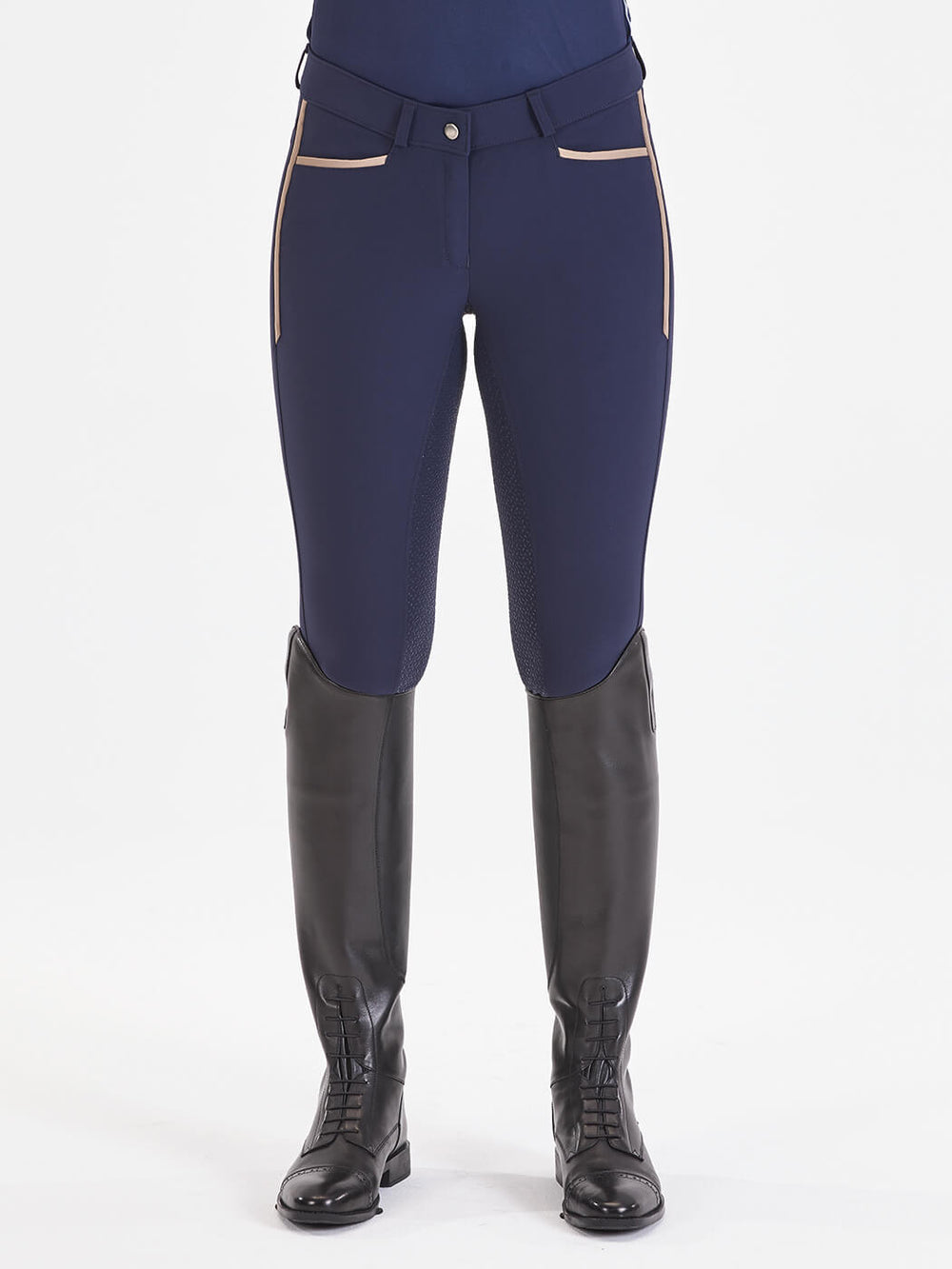 - harmonious and easily combinable decorative pipings in contrasting colour at the pockets and at the sides of the thighs