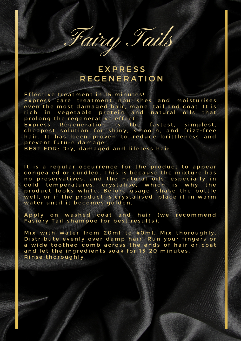 Express care treatment nourishes and moisturizes even the most damaged hair, mane, tail and coat. It is rich in vegetable protein and natural oils that prolong the regenerative effect.